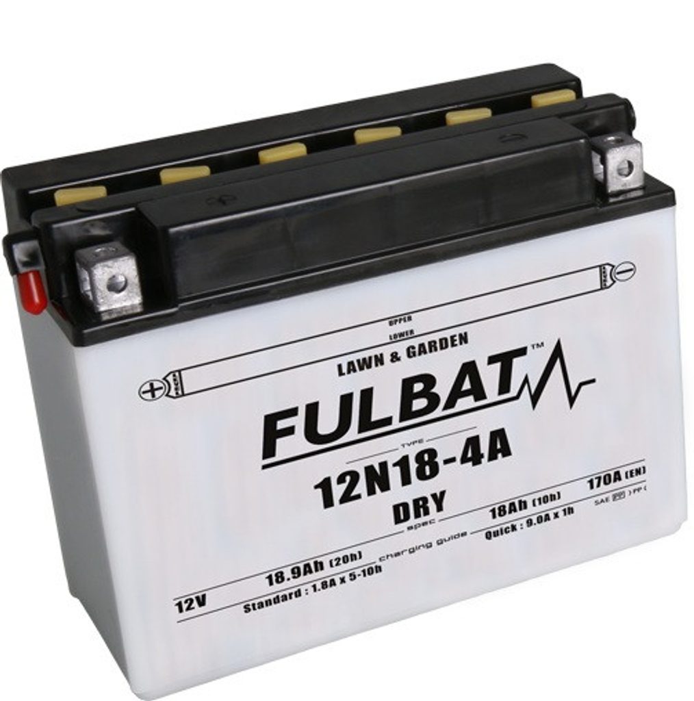 12N18-4A je součástí naší řady DRY. Je speciálně navržena pro dobrý výkon a vysokou odolnost vůči vibracím. Tato 12V baterie s kapacitou 18,9 Ah je dodávána s balením elektrolytu (kyseliny), musí být aktivována před prvním použitím a pravidelně kontrolována.