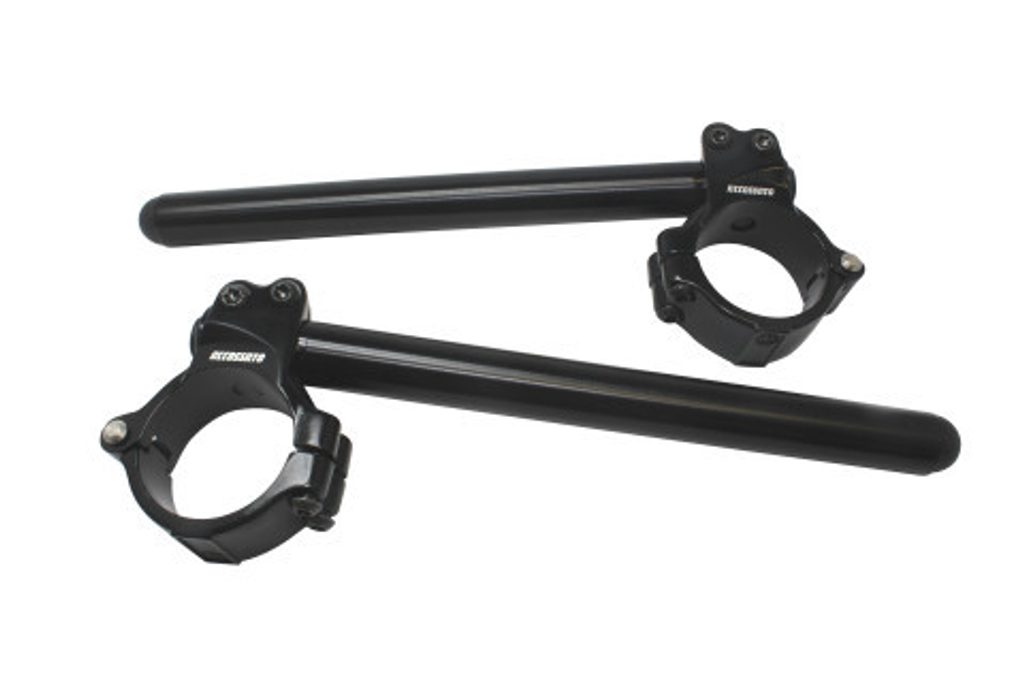 Hliníková kovaná clip-on řídítka ACCOSSATO s kovovou objímkou ze dvou půlkruhů, úhel sklonu 10°.