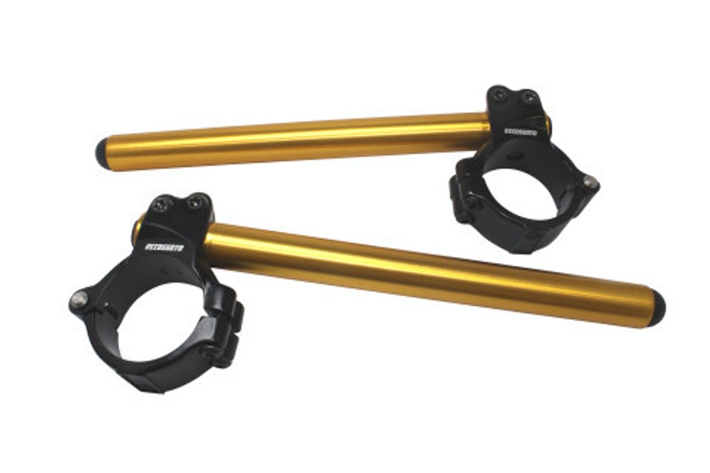 Hliníková kovaná clip-on řídítka ACCOSSATO s kovovou objímkou ze dvou půlkruhů, úhel sklonu 10°.