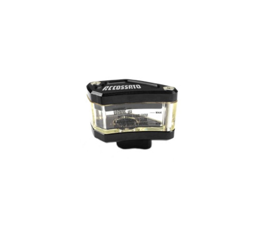 Průhledná nádržka na kapalinu ACCOSSATO, objem 20 cm3, dodávána s vertikálním a horizontálním vývodem. Držák není součástí balení.