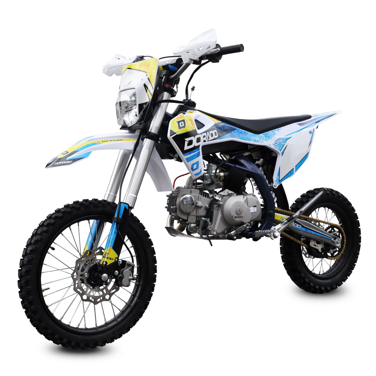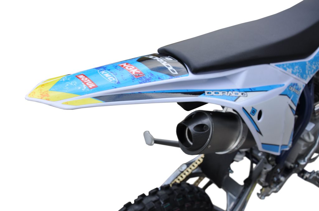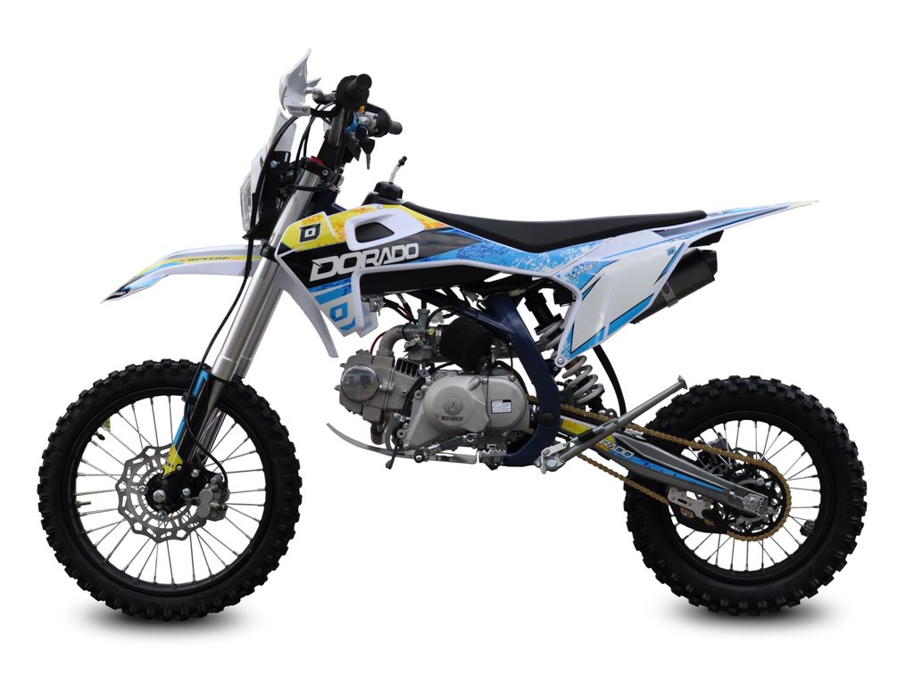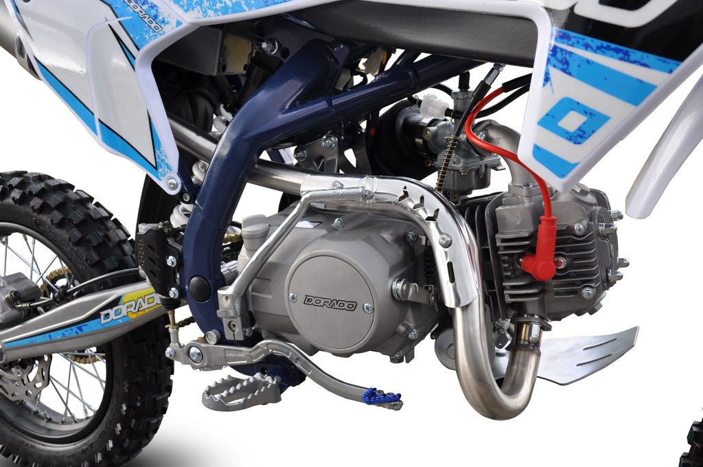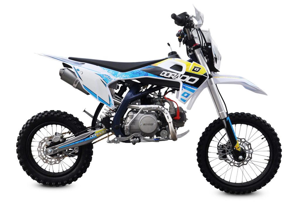 Motocykl Dorado DT 125cc 4t 17“/14“ má výkon 6.3kW, manuální převodovku, sportovní výfuk, přední i zadní hydraulické kotoučové brzdy (zadní-nožní), přední kolo 17 palců, zadní kolo 14 palců, přední světlo.