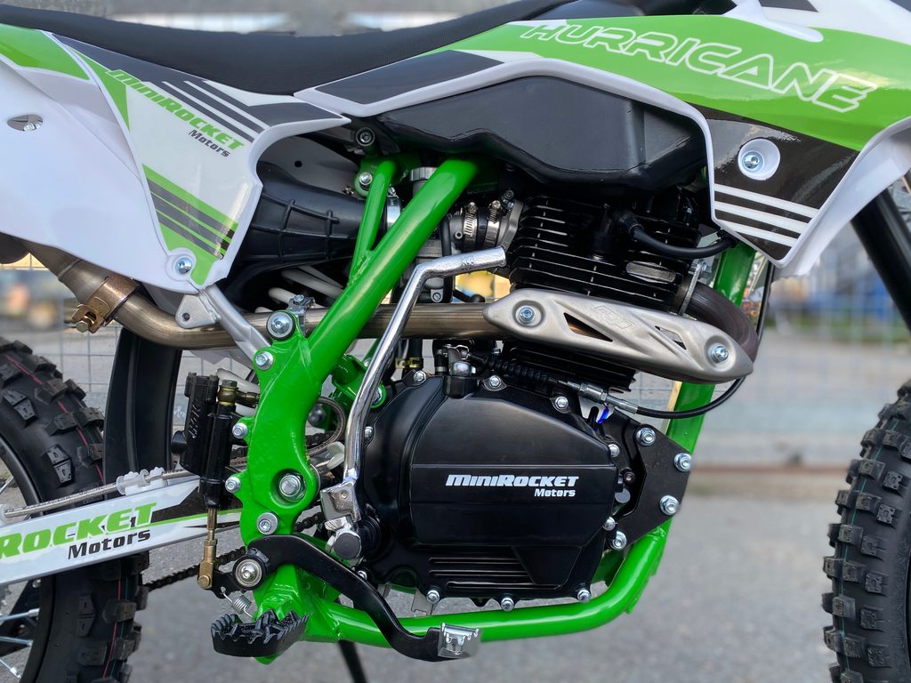 Pitbike Hurricane 250cc má vysoký výkon 13,4 Kw, manuální 5-ti stupňovou převodovku, laděný výfuk s úchvatným zvukem, přední i zadní hydraulické kotoučové brzdy, kvalitní přední vidlice, nastavitelná tuhost zadního odpružení, nožní našlapávání, přední kolo 19 palců, zadní kolo 16 palců a masivní rám lakovaný do barvy.