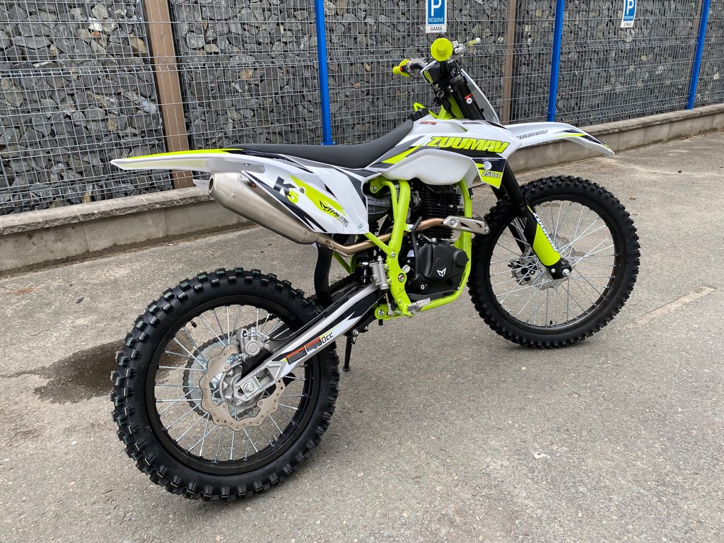 Na prodej čtyřtaktní motorka vhodná pro pokročilé od 13-ti let až po dospělé. Motocykl - Dirt bike ZUUMAV 250cc K5-CB225G 4t 21/18 je určen pro nadšence motosportu. Má výkon 12 kW, manuální převodovku, dobře laděný výfuk, přední i zadní hydraulické kotoučové brzdy, elektrický startér, přední kolo 21" a zadní kolo 18".