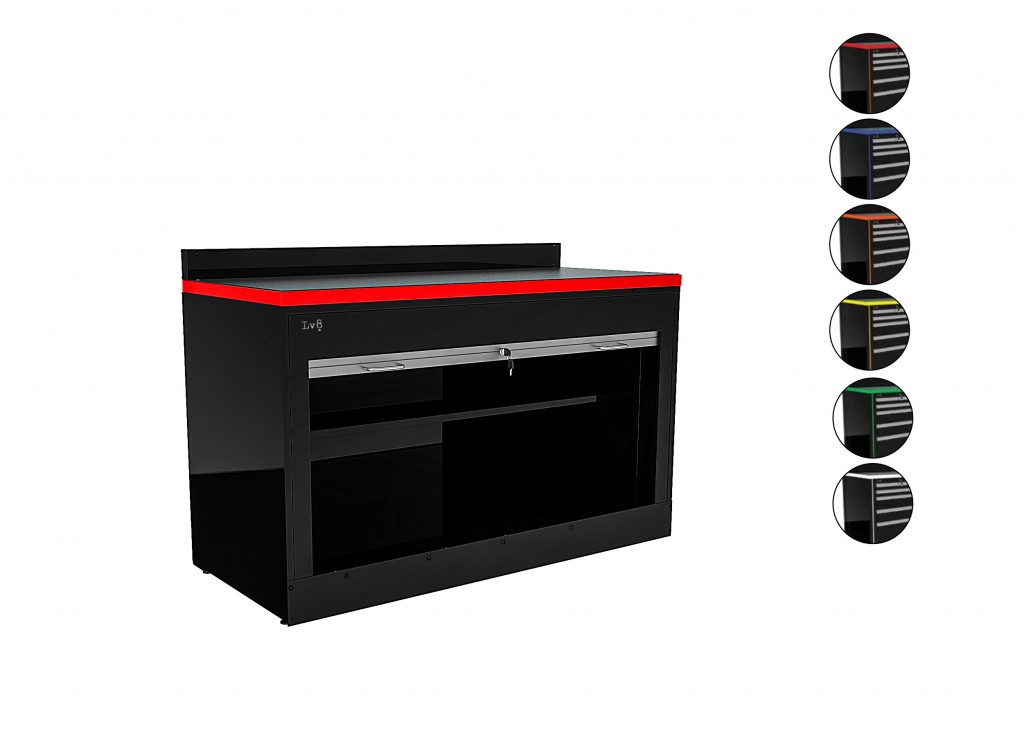 L.1600 mm Workbench with L 1600mm. Cabinet with roller shutter, key lock and inside shelf, H 100mm. Blind bottom closing panel, Worktop and Anti-Petrol and Anti-Oil ABS Worktop cover.