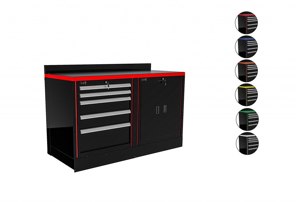 L 1600 mm Workbench with L 800 mm Cabinet with 5 drawers, L 800mm. Cabinet with 2 doors, key lock and adjustable inside shelf, H 100mm. Blind bottom closing panel, Worktop and Anti-Petrol and Anti-Oil ABS Worktop cover.