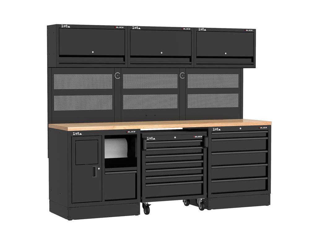 Pracovní stůl délky 2400 mm se servisní skříňkou (držák na papír a úložná zásuvka), 7 zásuvkovým pojízdným vozíkem a 5 zásuvkovou skříňkou se zámkem. Masivní dřevěná pracovní deska, perforované panely na nářadí, tři nástěnné úložné skříňky a příprava pro připojení elektrické zásuvky. K dispozici i ve variantě s nerezovou nebo melaminovou deskou.