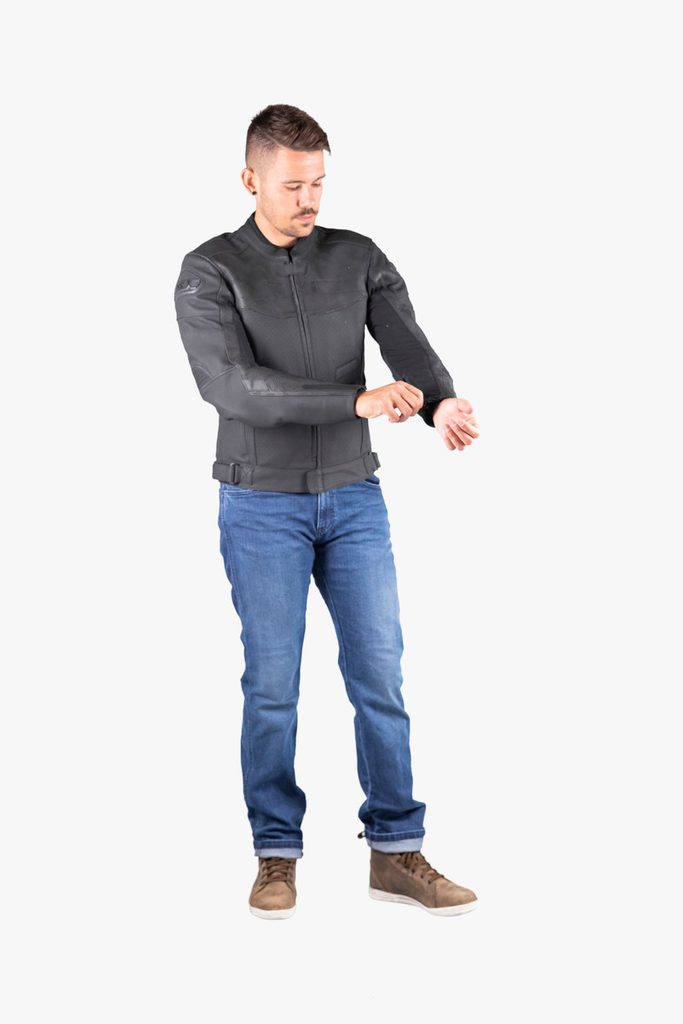 Odvětrávaná sportovně-cestovní bunda vyrobená z full-grain hovězí usně s velkoplošnými perforovanými panely, které zajišťují skvělé větrání a tepelný komfort. Ozdobné panely s barevnými vzory tón v tónu na prsou a zádech.