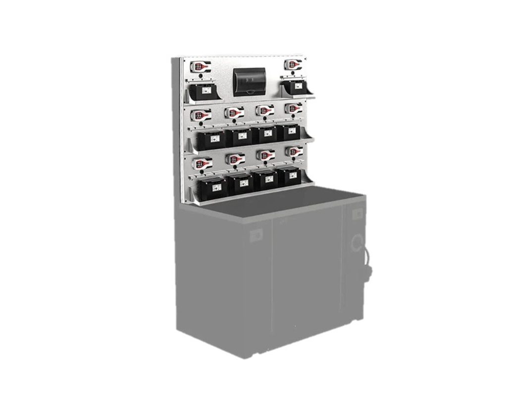 Nerezový nástěnný panel s policemi pro uložení baterií. Panel je konfigurovatelný až pro 10 nabíječek a je navržen tak, aby poskytoval ergonomické a efektivní místo pro přípravu a údržbu olověných a lithiových baterií. Nabíječky a elektrický rozvaděč lze objednat samostatně.