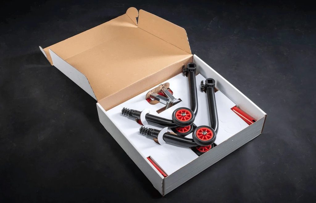 Patentovaný zadní stojan na motorku dodávaný ve třech snadno montovatelných dílech - lze ho sestavit bez použití šroubů a šroubováků.